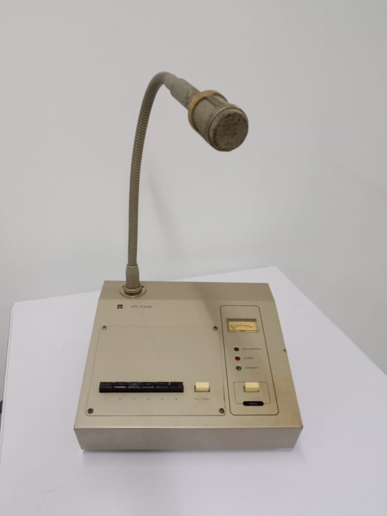 The TOA VR-1006 Paging Microphone Console, produced by TOA Electric Co., Ltd., Kobe, Japan, around the 1980s–1990s, is a communication and audio equipment artifact used in Public Address (PA) systems to deliver announcements to specific zones within a building. Equipped with a gooseneck microphone, VU meter, and zone selection controls, it reflects the use of analog technology for efficient and centralized communication in institutions and facilities prior to the widespread adoption of digital systems.